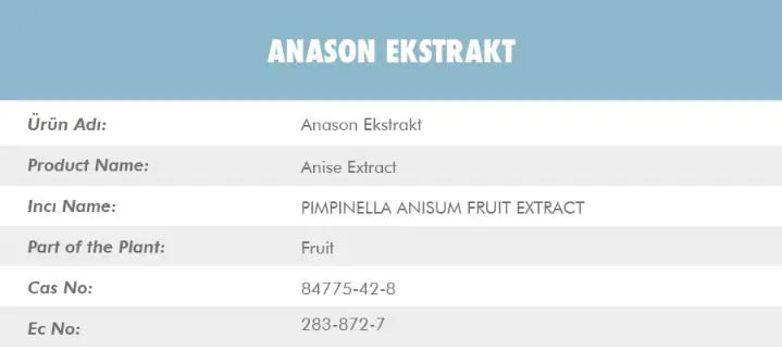Anason Ekstraktı'nın (Anise Extract), latincesi PIMPINELLA ANISUM FRUIT EXTRACT. Anason ekstraktı bitkinin meyve kısımlarından elde edilmektedir. Cas numarası ise 84775-42-8.