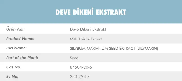 Deve Dikeni Ekstraktı'nın (Milk Thistle Extract), latincesi SILYBUM MARIANUM SEED EXTRACT. Deve dikeni ekstraktı bitkinin tohum kısımlarından elde edilmektedir. Cas numarası ise 84604-20-6.