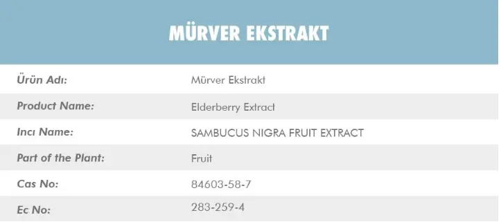 Mürver Ekstraktı'nın (Elderberry Extract), latincesi SAMBUCUS NIGRA FRUIT EXTRACT. Mürver ekstraktı bitkinin meyve kısımlarından elde edilmektedir. Cas numarası ise 84603-58-7.