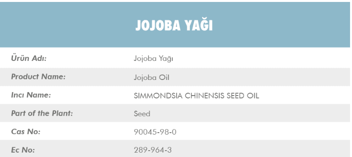 Jojoba Yağı’nın (Jojoba Oil), latincesi SIMMONDSIA CHINENSIS SEED OIL. Jojoba Yağı, bitkinin tohum kısmından elde edilmektedir. Cas numarası ise 90045-98-0.