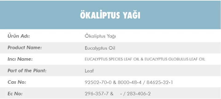 Okaliptus Yağı’nın (Eucalyptus Oil), latincesi EUCALYPTUS SPECIES LEAF OIL & EUCALYPTUS GLOBULUS LEAF OIL. Okaliptus Yağı, bitkinin yaprak kısmından elde edilmektedir. Cas numarası ise 92502-70-0 & 8000-48-4 / 84625-32-1.
