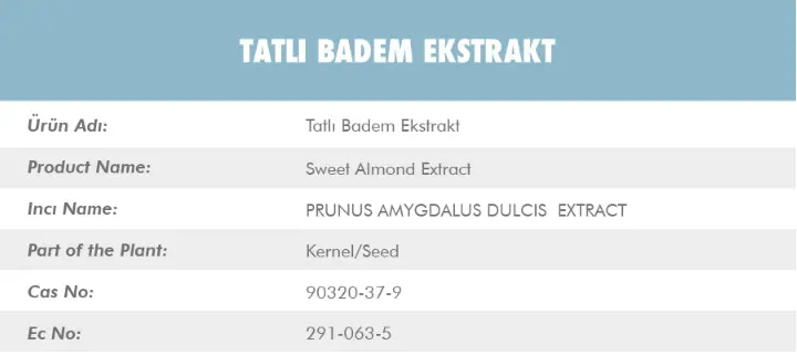 Tatlı Badem Ekstrakt'nın (Sweet Almond Extract), latincesi PRUNUS AMYGDALUS DULCIS EXTRACT. Tatlı badem ekstraktı bitkinin çekirdek ve tohum kısımlarından elde edilmektedir. Cas numarası ise 90320-37-9.